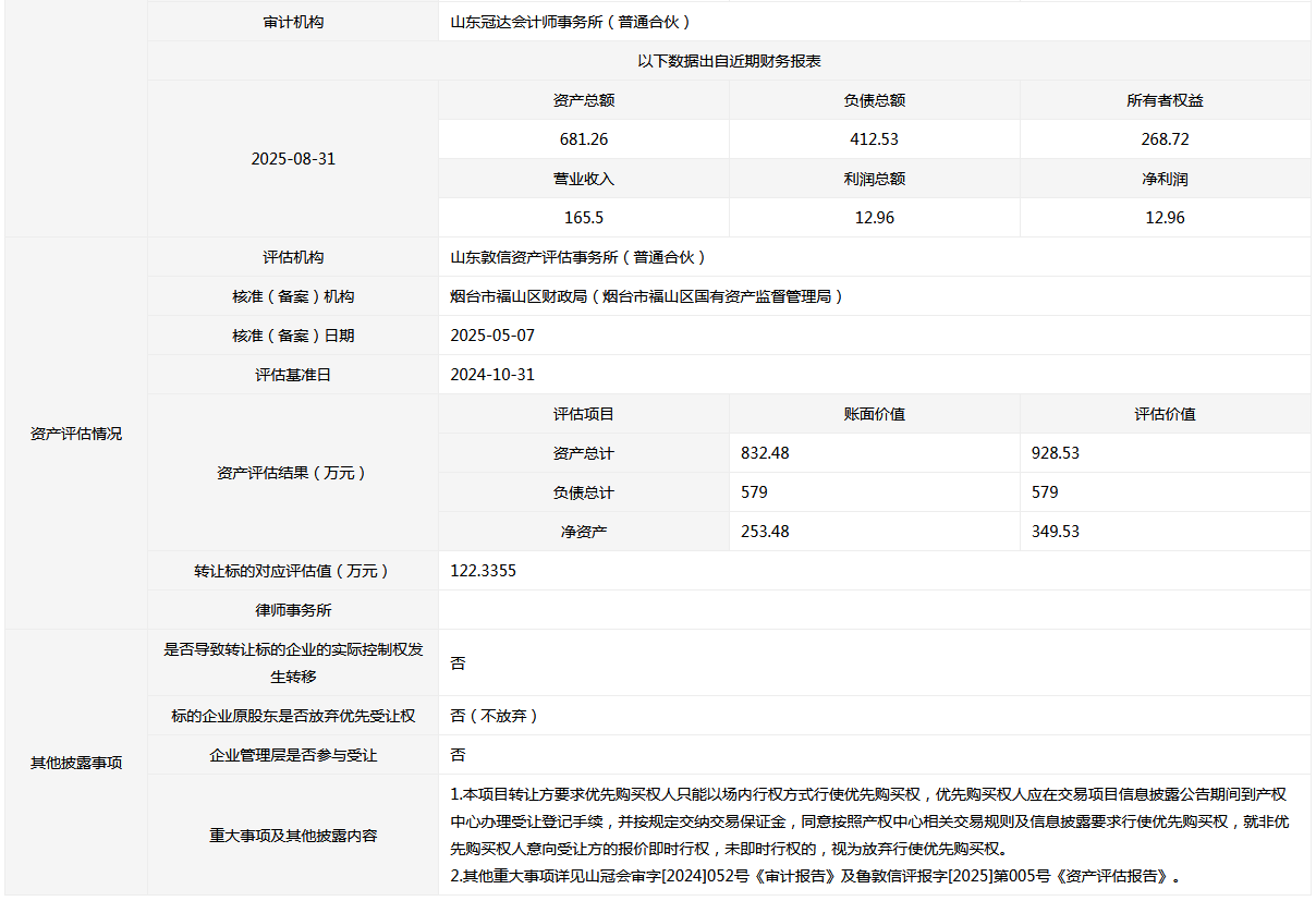 • 轉(zhuǎn)讓方: 煙臺(tái)市福山區(qū)財(cái)政局(煙臺(tái)市福山區(qū)國(guó)有資產(chǎn)監(jiān)督管理局)
