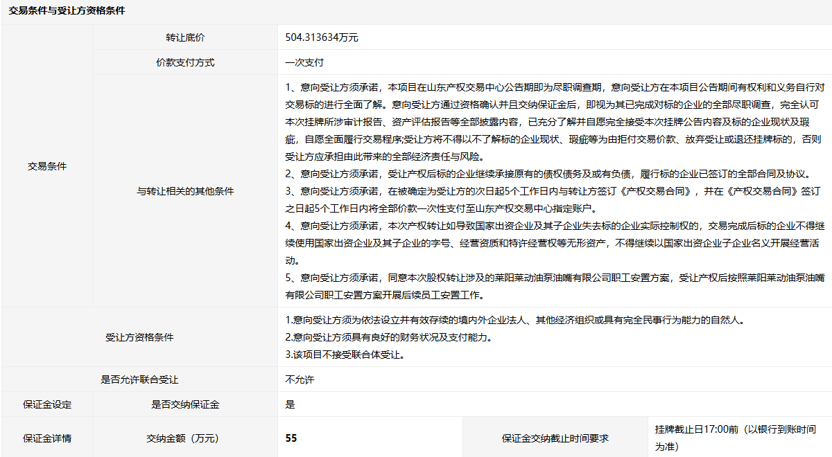 萊陽萊動油泵油嘴有限公司53.8824%股權(quán)